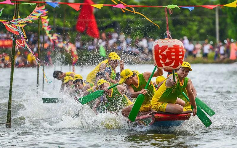 赛龙舟是端午节的主要习俗。相传起源于古时楚国人因舍不得贤臣屈原投江死去,许多人划船追赶拯救,他们争先恐后,追至洞庭湖时不见踪迹,之后每年五月五日划龙舟以纪念之,相传划龙舟是为了驱散江中之鱼,以免鱼吃掉屈原的身体。