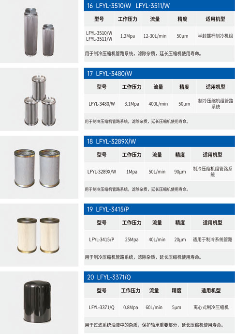 制冷过滤器滤芯安装于油冷却器后的输油管道的油泵前,用以滤除较大的杂质,保护油泵,延长油精滤芯的使用寿命。