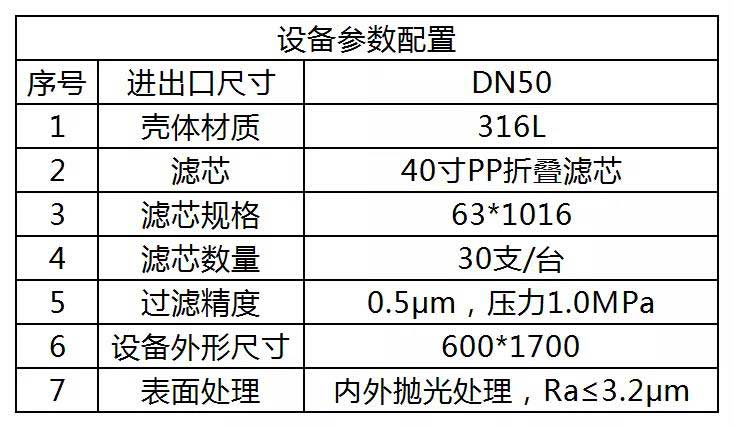 保安过滤器在压力的作用下,使原液通过滤材,滤渣留在滤材上,滤液透过滤材流出,能有效去除水中杂质、沉淀物和悬浮物,从而达到过滤的目的。 参数配置如下: