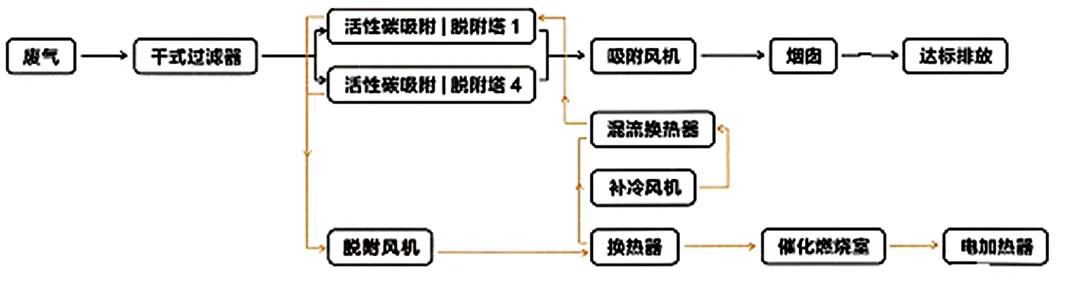 催化燃烧之后的气体通过换热器,进行热交换后降温的气体,部分通过烟囱排放,另一部分用于活性炭的脱附再生,从而达到余热利用和节能的目的。