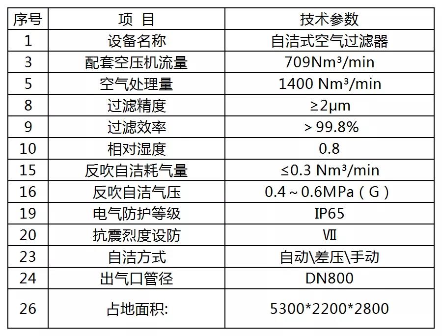 该自洁式空气过滤器每台配备72个滤筒,外壳采用不锈钢材质,主要用于空压机前置过滤,具有在线自洁功能,可保证空压机连续工作,延长使用寿命。