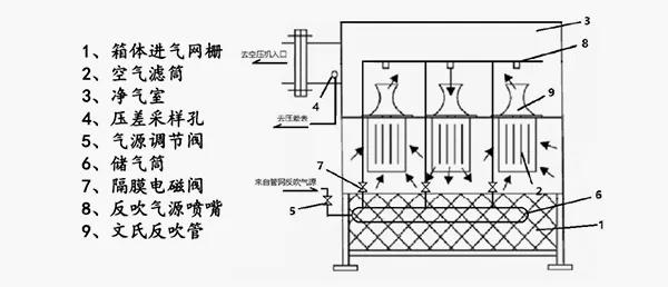 自洁过程:含尘空气经过滤后,尘埃被吸附在高效过滤筒上,由 PLC 按设定时间顺序进行反吹自洁过程,当阻损值超过 600 帕时,由 PLC 按差压顺序控制反吹自洁过程(反吹时间为 0.1 秒),其它高效过滤筒照常工作,尘埃被反吹自洁下来。