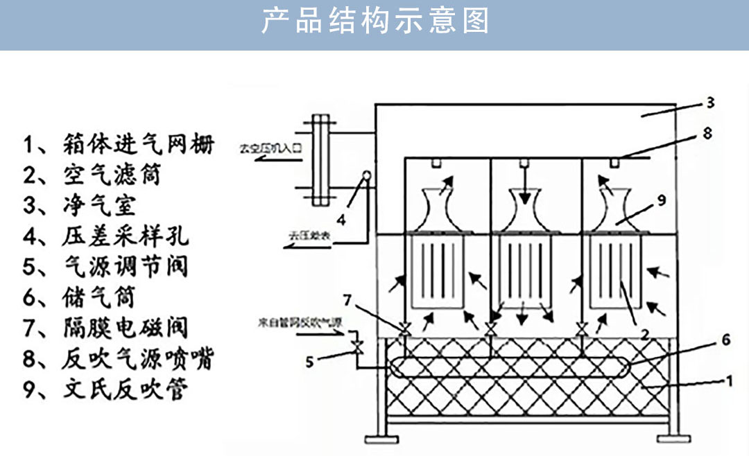 3、本设备可实现空气过滤元件的自动清洁,使设备照常运行,而不影响其他过滤元件正常工作。