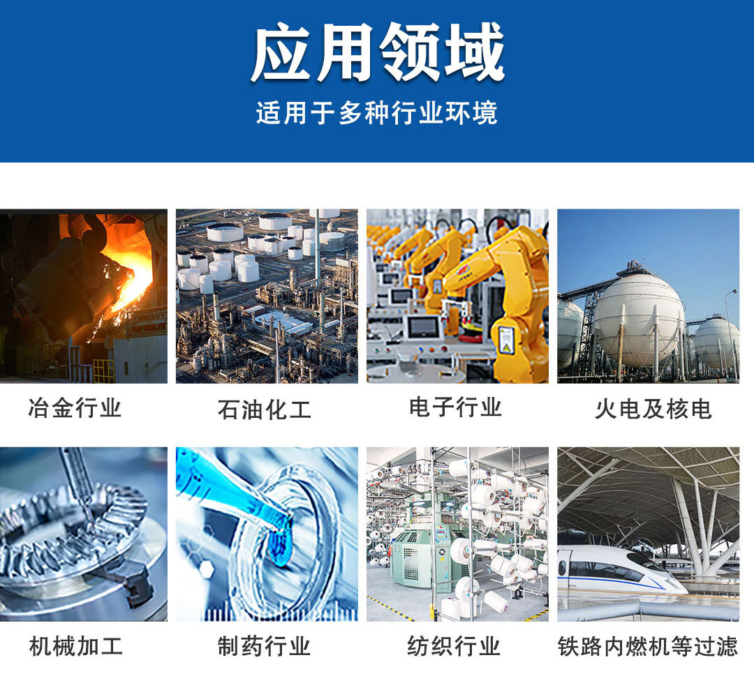 钢铁的高炉鼓风、离心式空压机、燃气轮机、需长时间运转的柴油机及汽轮机、对空气洁净度要求较高的集中式中央空调系统以及其它大型机组的入口过滤和粉尘涂装的粉末回收系统