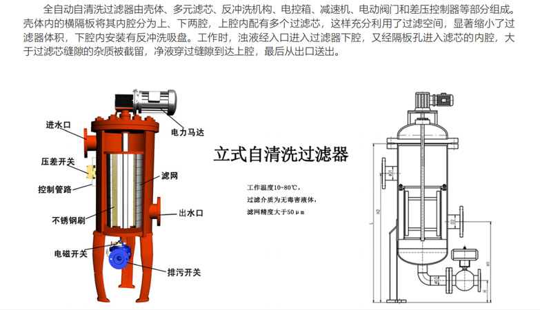 与传统的过滤器相比有如下特点:自动化程度高;压力损失小;不必进行人工清除滤渣。自清洗过滤器适用于工业、农业、市政、海水淡化过程等的分离过滤。因为我国环境治理的需要,自清洗过滤器等许多环保设备被大批量的应用到了各大工业生产线中,以求得到切实有效的污水治理效果。现在,随着焦点娱乐对污水治理技术的研究深入和逐步改造,针对造纸业污水治理的高科技方法逐步推广到了各大造纸厂。 现在的造纸污水处理通过改进造纸原料漂白技术,增加生物酶预漂白段和改用单线态氧强化碱抽提漂白技术,减少了中段废水及污染物排放量。同时,在废水处理工段采用了厌氧和好氧生物处理技术,三段处理采用化学絮凝沉淀法以及双聚合系统,并在该系统中运用了高科技的自清洗过滤器等过滤装置,进一步降低了废水浊度及色度,回收水率达到了80%,实现了废水的资源化高效利用。