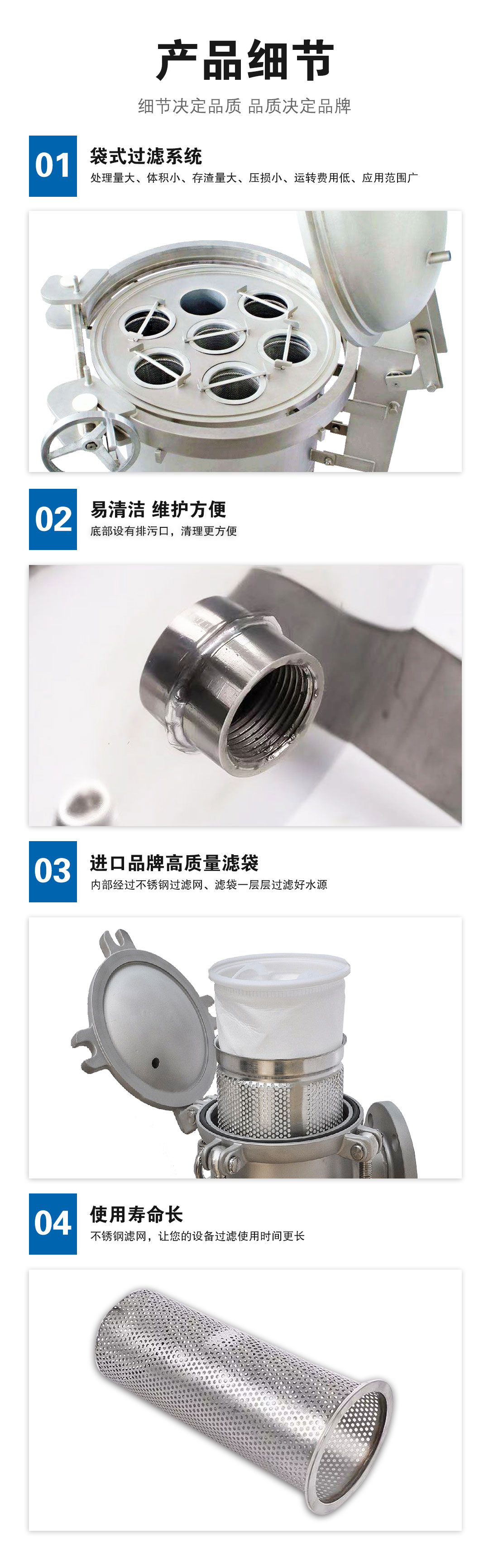 LFD-2-2P袋式过滤器采用顶入底出方式,通过管道中的压力将过滤液体介质压入或抽入袋式过滤器桶体,要过滤的液体介质经由不锈钢板冲孔支撑滤蓝承托的过滤袋平稳的过滤,使过滤液体产生理想的固液分离达到液体介质被过滤的效果。由于液体介质进入滤器后是从滤袋顶端流入,使得液体可均匀分布在整个滤袋的过滤表面,令整个层面中的流体分布恒定一致,紊流的负面影响小,过滤效果好.