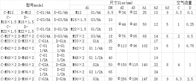 一.产品简介 C 型空气滤清器适用于减速器排气用。它能维持减速器箱体内的压力和大气压力平衡,并防止赃物颗粒从外部进入箱体,保持箱体内油液的清洁,延长减速器的使用寿命 . 二.技术参数及连接尺寸 型号model 尺寸Size(mm) 空气流量(m3/min) d1 DN d2 d3
