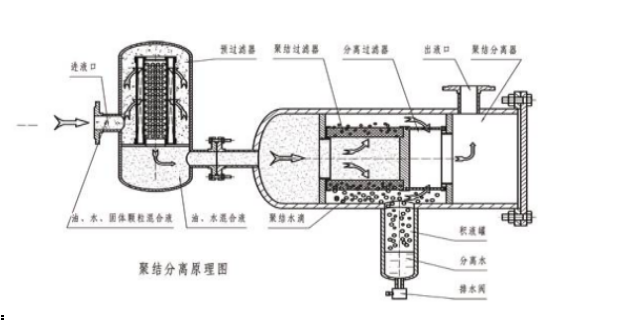 分离系统的分离滤芯由特殊的疏水材料制成,油液通过滤芯时,水珠被挡在滤芯的外表面,相互聚结直至因重力作用,沉降至储水罐内。