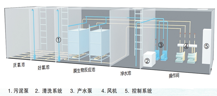 一体化MBR污水处理设备可以做地埋式也可以做地面式,都是以MBR系统及生化法为核心处理污水,一般项目的处理水量在100吨以内, 这样用一体化污水处理设备造价成本比传统工艺更低,性价比更高。 膜生物反应器(MBR)技术以超、微滤膜分离过程取代传统活性污泥处理过程中的泥水重力沉降分离过程进行固液分离,由于采用膜分离,因此可以保持很高的生物相浓度和非常优异的出水效果。可有效去除水中的有机物与氨氮等污染物质,具有许多其他生物处理技术无法比拟的明显优势。 下图为MBR膜生物反应器(MBR)的工艺原理示意图: