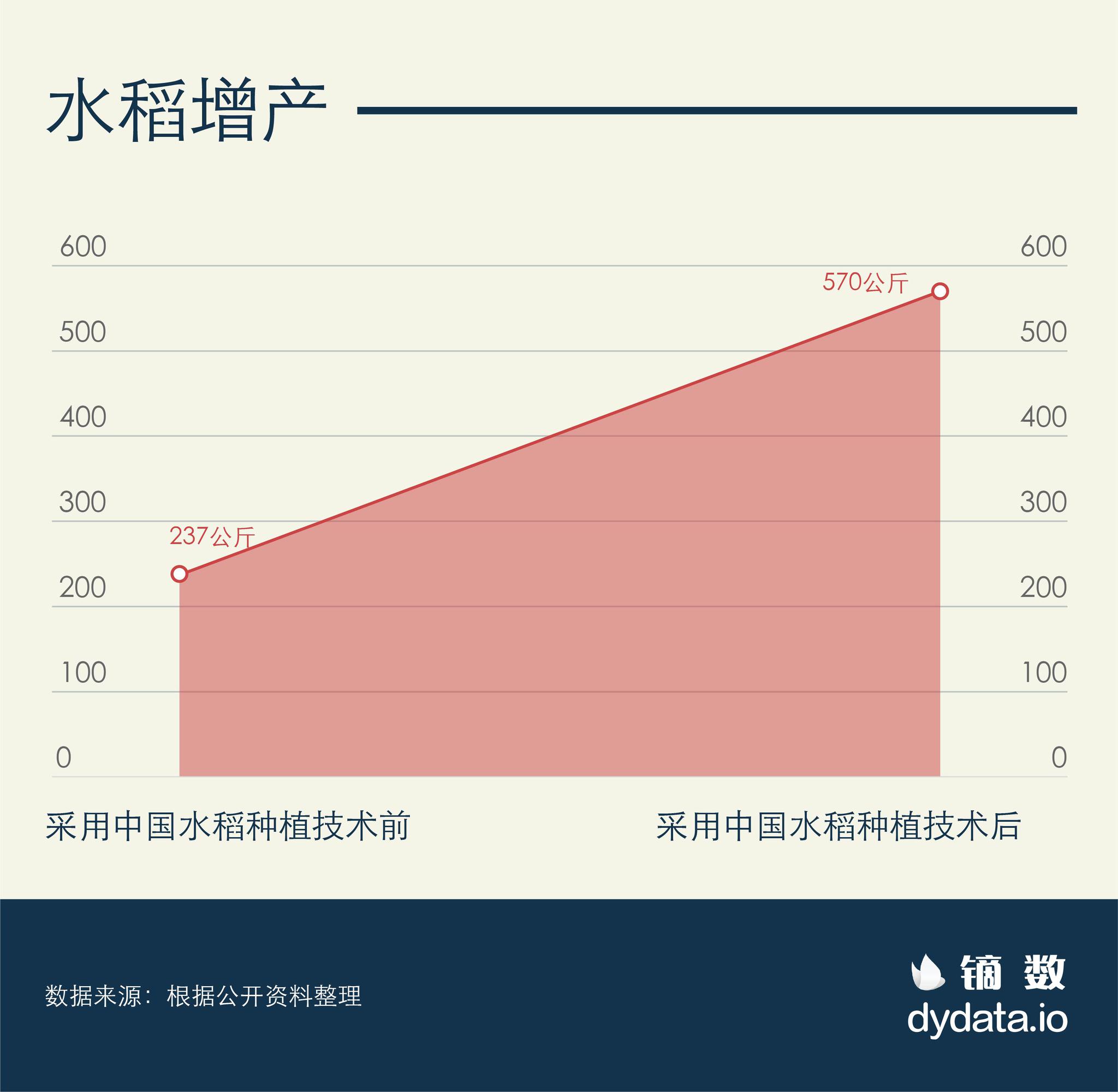 在坦桑尼亚的中国农业技术示范中心,采用中国水稻种植技术后,水稻每亩产量从原来的237公斤提高到570公斤,增产140%。