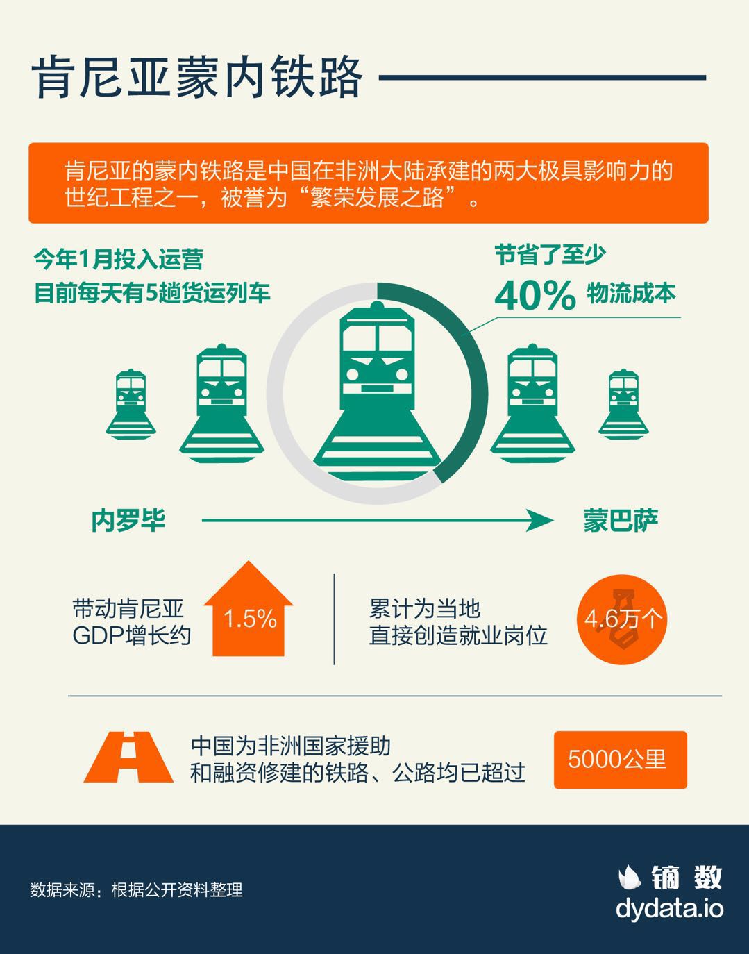 肯尼亚的蒙内铁路是中国在非洲大陆承建的两大极具影响力的世纪工程之一,被誉为“繁荣发展之路”。今年1月,蒙内铁路首列货运列车投入运营。目前每天有5趟货运列车穿行于首都内罗毕和东非第一大港蒙巴萨之间,节省了至少40%的物流成本。蒙内铁路每年带动肯尼亚GDP增长约1.5%,累计为当地直接创造4.6万个就业岗位。改革开放以来,中国为非洲国家援助和融资修建的铁路、公路均已超过5000公里。