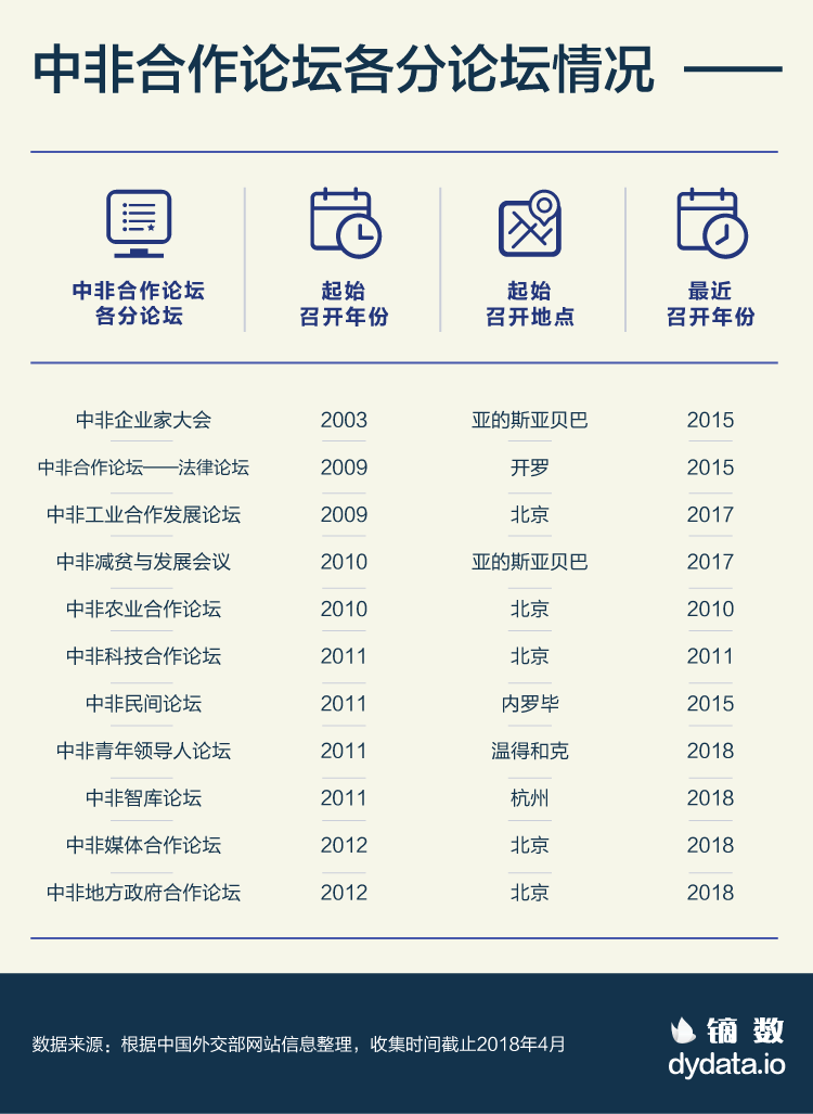 事实证明,中非合作论坛在过去的18年始终发挥着引领和推动中非关系的重要作用,在不同时期积极地为中非合作规划路线。不仅如此,论坛也成为拓展中非合作空间的有效助力。从下图不难看出,随着民间、媒体等分论坛的启动,中非合作也已从论坛成立初期重于经贸合作逐渐拓展到目前的政治、经济、安全、社会、人文、环境等诸多领域的全方位合作。
