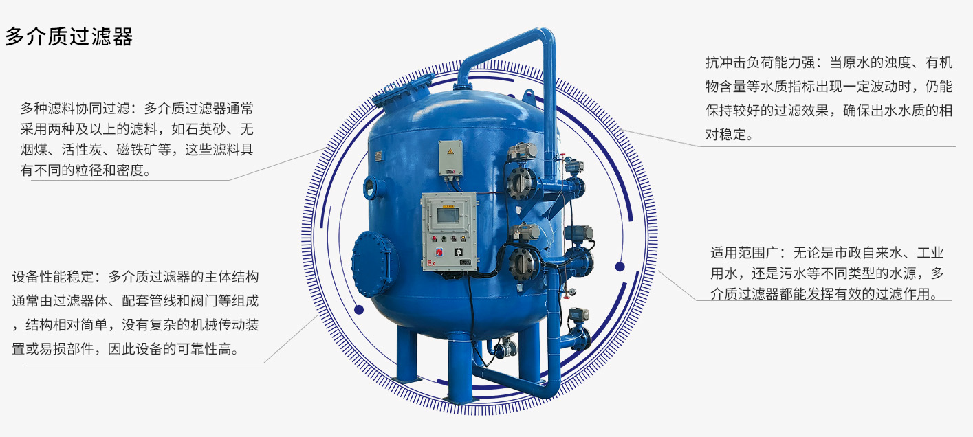产品概述:多介质过滤器是利用两种以上的不同滤料组合,在一定的压力下,使原液通过该介质,去除杂质,从而使水质净化达标。主要是利用填料来降低水中浊度,截留除去水中悬浮物、有机物、胶质颗粒、微生物、氯嗅味及部分重金属离子,是给水净化系统中重要一种水处理设备。