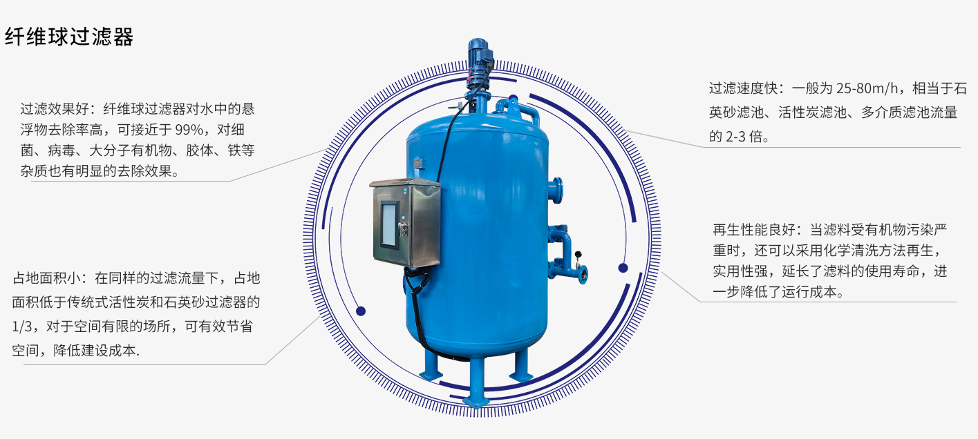 纤维球过滤器采用纤维球作为过滤介质。纤维球具有弹性好、比表面积大等特点。当含油污水通过过滤器时,油滴在纤维球表面及内部孔隙中发生拦截、吸附、凝聚等作用,从而从水中分离出来并附着在纤维球上,实现水油分离。因此,可以处理后可以达到特定的排放标准或满足回用要求。