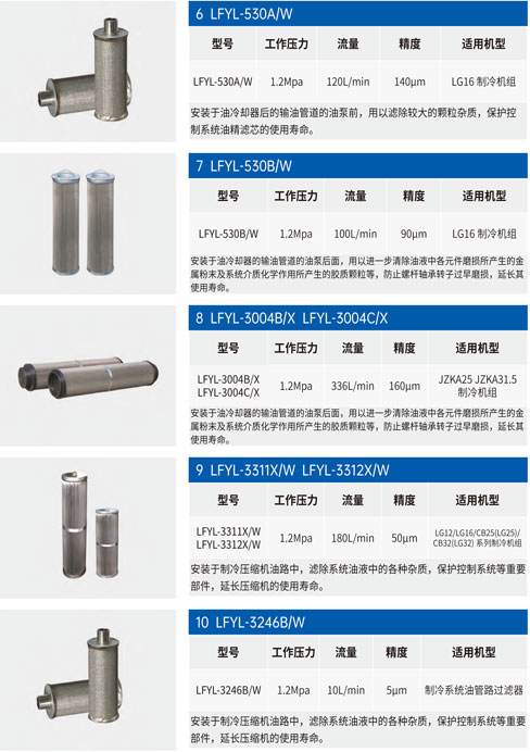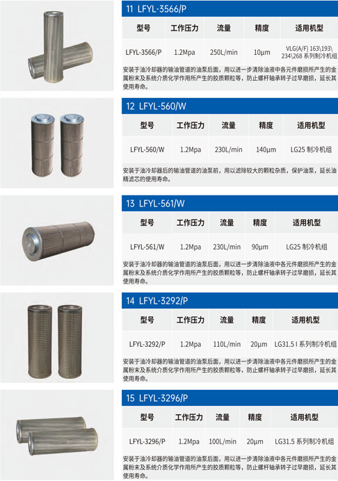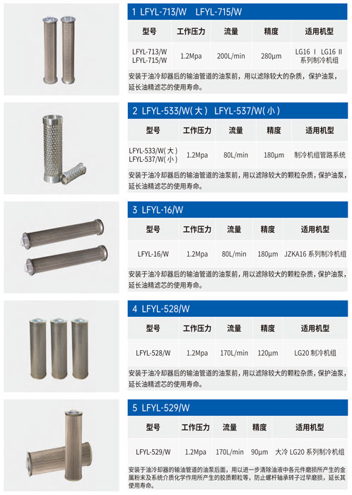 制冷过滤器滤芯安装于油冷却器后的输油管道的油泵前,用以滤除较大的杂质,保护油泵,延长油精滤芯的使用寿命。